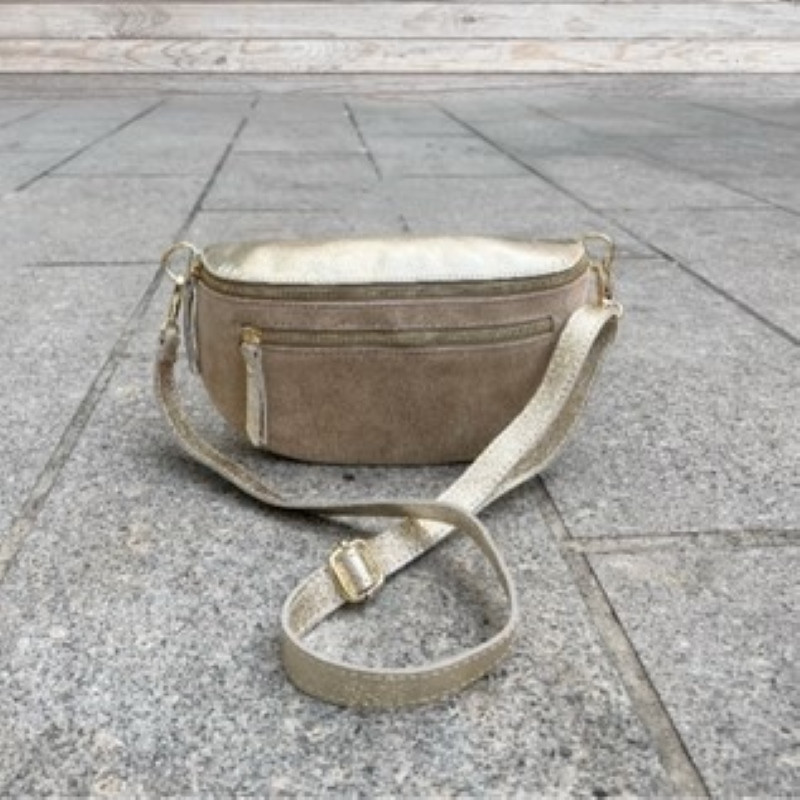 Sa façade en daim lui confère une texture douce et chic, tandis que le dos en cuir irisé doré ajoute une touche d'élégance qui ne passera pas inaperçue. Que ce soit pour une sortie décontractée ou une soirée élégante, ce sac banane est l'accessoire idéal pour compléter votre tenue.